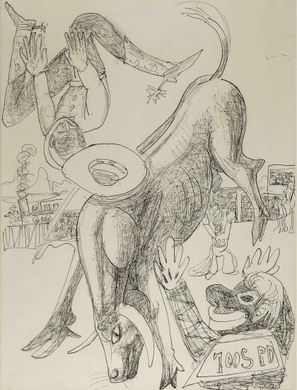 Beckmann never returned to Germany but found teaching posts in St Louis and New York. His US works suggest he had finally found sustained stability required for a practice defined by objectivity and soul-searching – though these were cut short by his death, at age sixty-six, in 1950. In Students (1947), he brings a large group to life through depicting individual expressions of character as physical attributes. Rodeo (1949) may have been his first, but it’s a study that captures a quintessential American pastime with a finesse only available to the outsider.