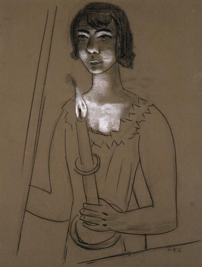 For Beckmann, it offered a return to the standpoint he had striven for throughout his career — cold and detached but perpetually stimulated by both human anatomy and the material world. His works from the mid- to late 1920s are his most domestic, though their emotional distance means they retain a certain skepticism toward bourgeois existence. In Quappi with Candle (1928), he uses black pencil and white gouache to create a heightened sense of darkness in what remains a thoroughly minimalist work. The figure, his second wife Mathilde “Quappi” von Kaulbach, would seem ghostly were it not for her unusually muscular arms. We see her in totally different dress — and demeanor — in Quappi with Playing Cards (Patience) (1926) where her unusually long fingers draw our eyes — and seemingly hers, too — to the card table, which is tilted towards the frame. Like Beckmann’s own appearance in the frontispiece of Hell, Quappi plays the role of host — not in hell, but in her own parlor.