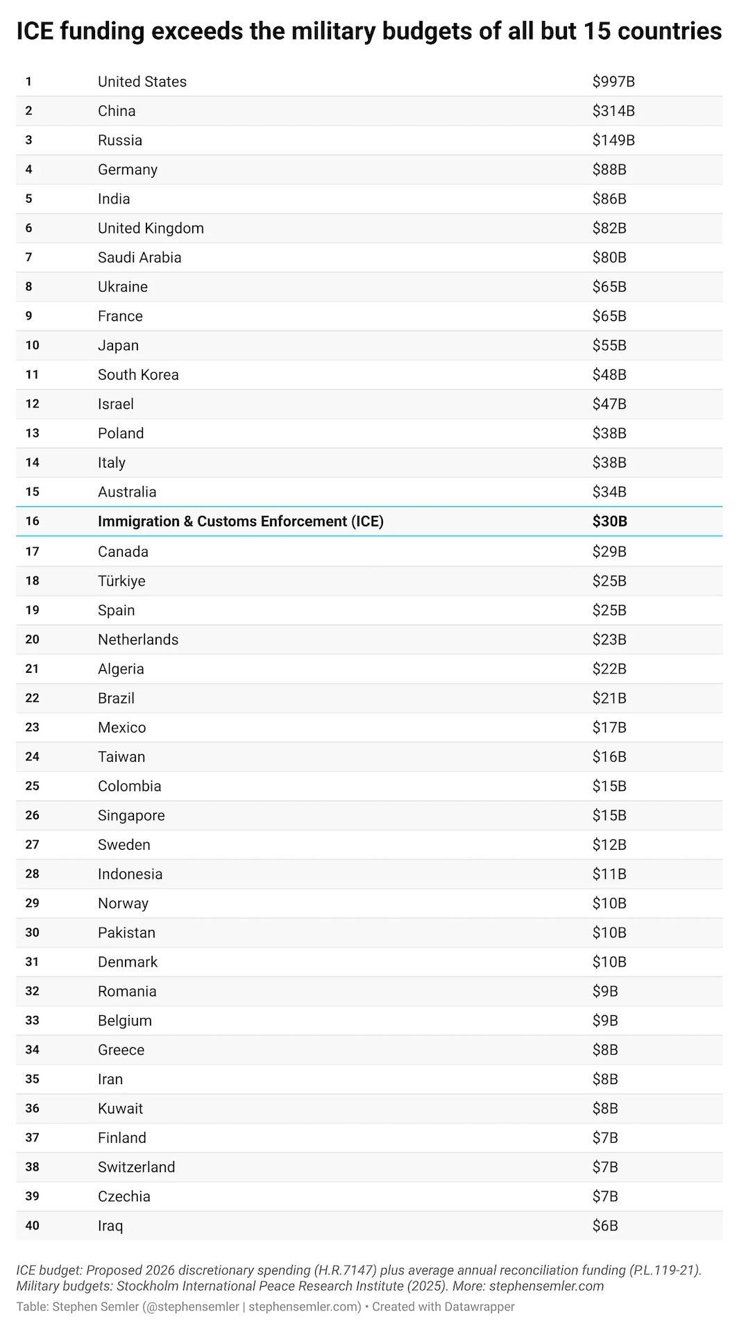 The table below ranks the pending $30 billion ICE budget among the highest funded militaries. It comes in at sixteenth, exceeding the military spending of countries like Canada, Spain, Brazil, Mexico, Sweden, Iran, and Switzerland. (Combined funding for ICE and the adjacent CBP stands at $66 billion, which would rank eighth.)
