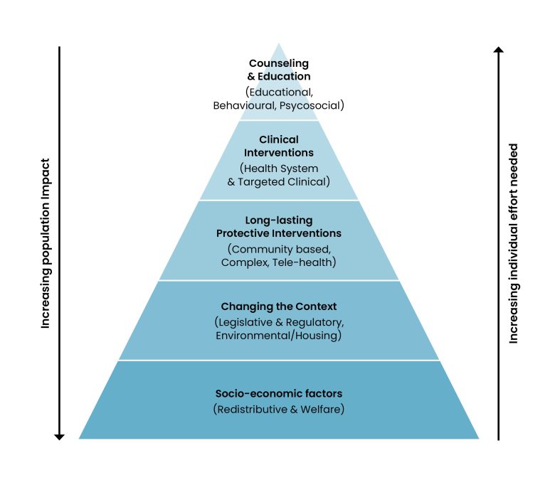 The Health Equity Pyramid, developed within the review, offers a clear way to understand why certain policies succeed while others fail. At its base sit interventions that reshape the social and economic foundations of health. Welfare, housing, and regulation operate at population scale, require minimal individual effort, and deliver the greatest equity gains. As one moves up the pyramid, interventions become more individualized, more conditional, and more demanding. Their reach narrows, and their equity impact diminishes.
