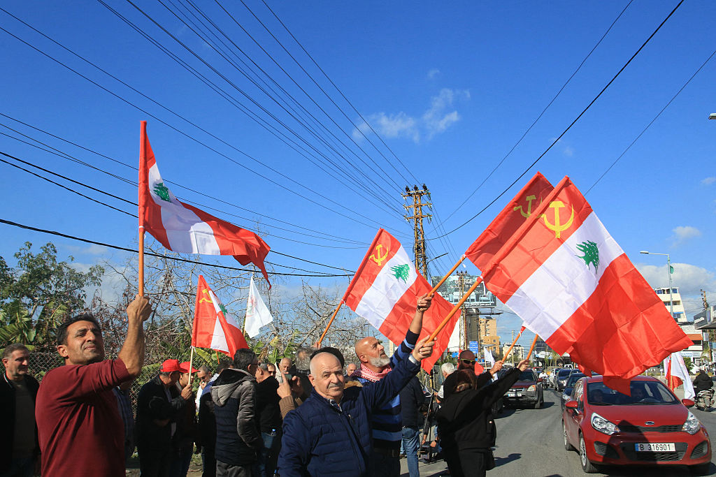 Members and supporters of the Lebanese Communist Party wave the national flag embossed with the communist hammer and sickle symbol as they rally on the highway that leads to the southern town of Naqura in the area of al-Hosh on December 19, 2025, to protest against Israeli attacks on Lebanon. (Mohamoud Zayat / AFP via Getty Images)