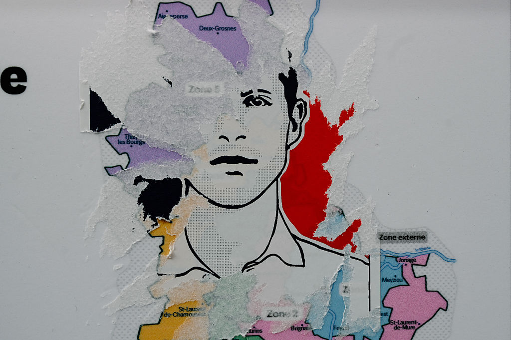 A half-torn sticker featuring the portrait of far right activist Quentin Deranque is pasted on a map of the Lyon metropolitan area. (Matthieu Delaty / Hans Lucas / AFP via Getty Images)