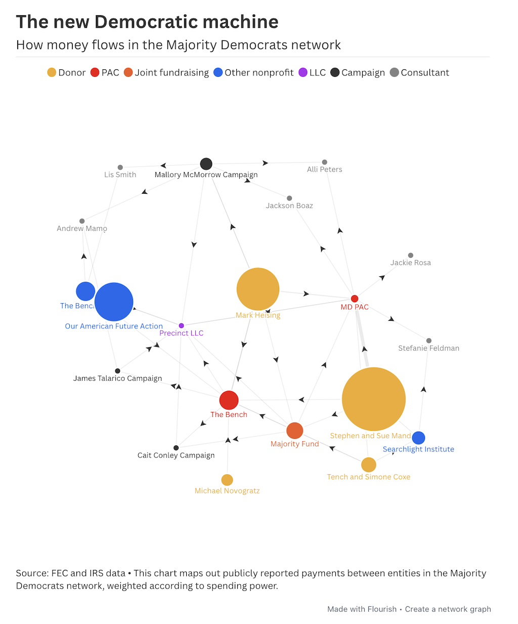 Mapping out the connective tissue of these operations quickly becomes a difficult endeavor. The Bench operates a super PAC, a traditional PAC, a joint fundraising committee, and a 527 nonprofit — a hodgepodge of entities that can engage in political spending with varying restrictions. All of them raise and spend money, at times in coordination with Majority Democrats, which has its own small galaxy of political committees.