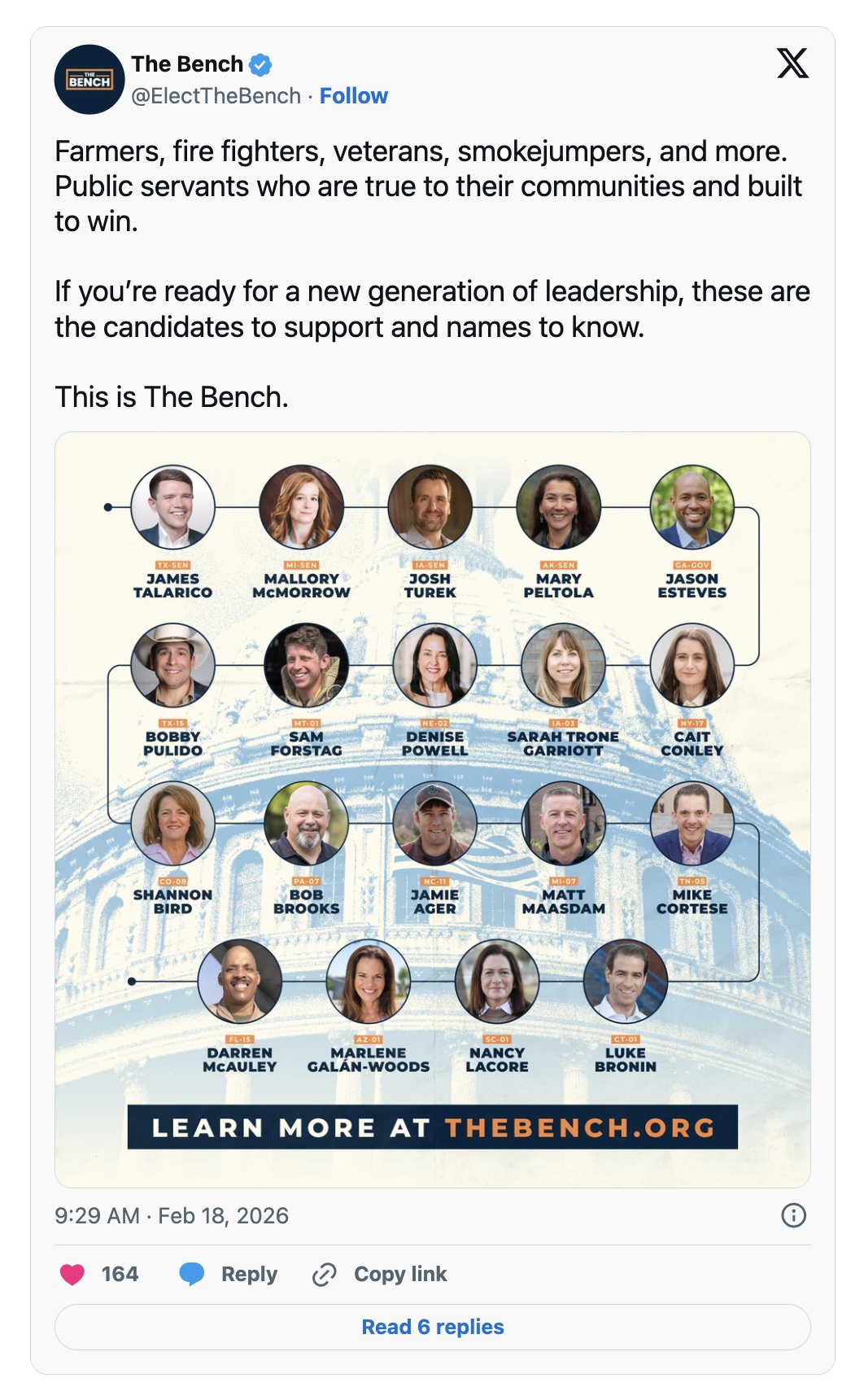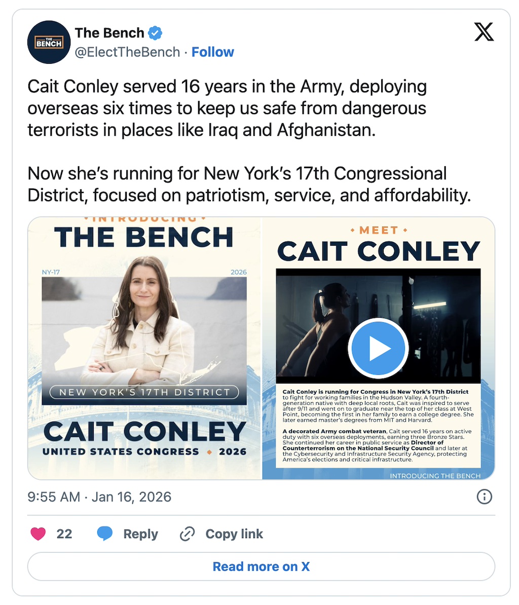 The Bench has endorsed a broad slate of candidates, including McMorrow in Michigan, James Talarico in Texas, Josh Turek in Iowa, Angie Craig in Minnesota, and Conley in New York.