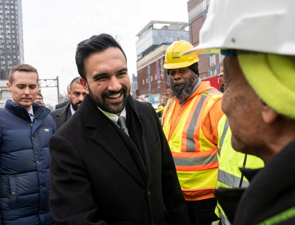Zohran Mamdani greeting workers at the site of the Williamsburg Bridge bump. (Adam Gray / Bloomberg via Getty Images)
