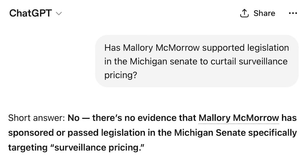 I started my search in the Michigan legislature and found a whole list of bills that reference pricing. I did find HB 5771 and HB 5222: Democratic legislation in the state’s GOP-led House that’s designed to curtail surveillance pricing. McMorrow is not listed as a sponsor of these bills nor do there appear to be versions of these bills in Michigan’s Democratic-led Senate, where McMorrow serves as the chamber’s majority whip.