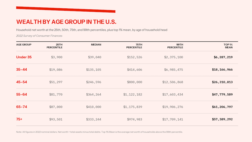Looking at wealth by percentile using the Federal Reserve’s Survey of Consumer Finances (SCF) provides a much more realistic picture of each age group’s net worth.