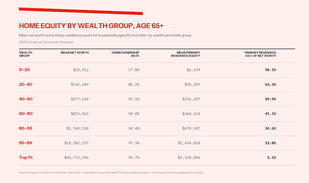 Making matters more complicated: even though older households are wealthier, on average, for most households over sixty-five, that wealth isn’t liquid. Instead, it’s equity in their primary residence.