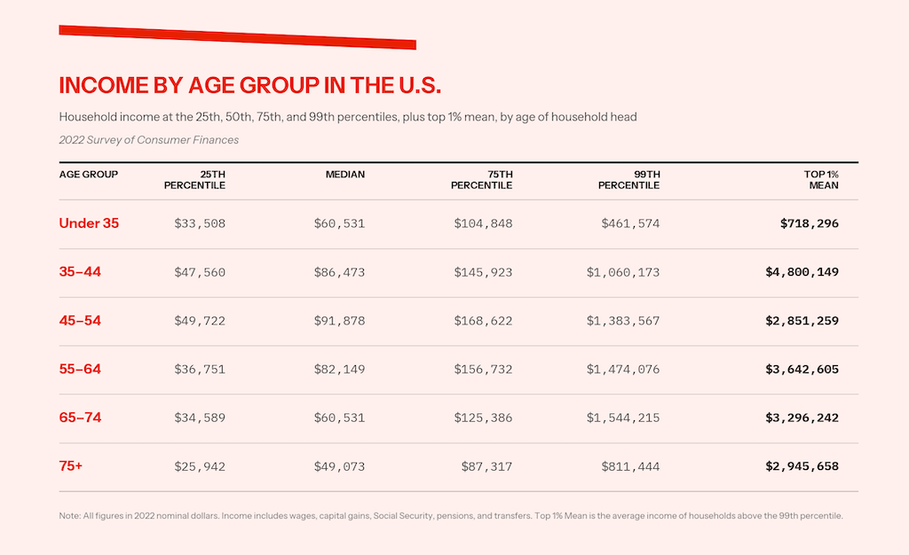 The 99th percentile of households aged sixty-five to seventy-four holds forty-seven times their age group’s median, while the top 1 percent averages 147 times the median. The lack of wealth at the bottom is just as consistent. The 25th percentile never exceeds half the overall median in any age group.