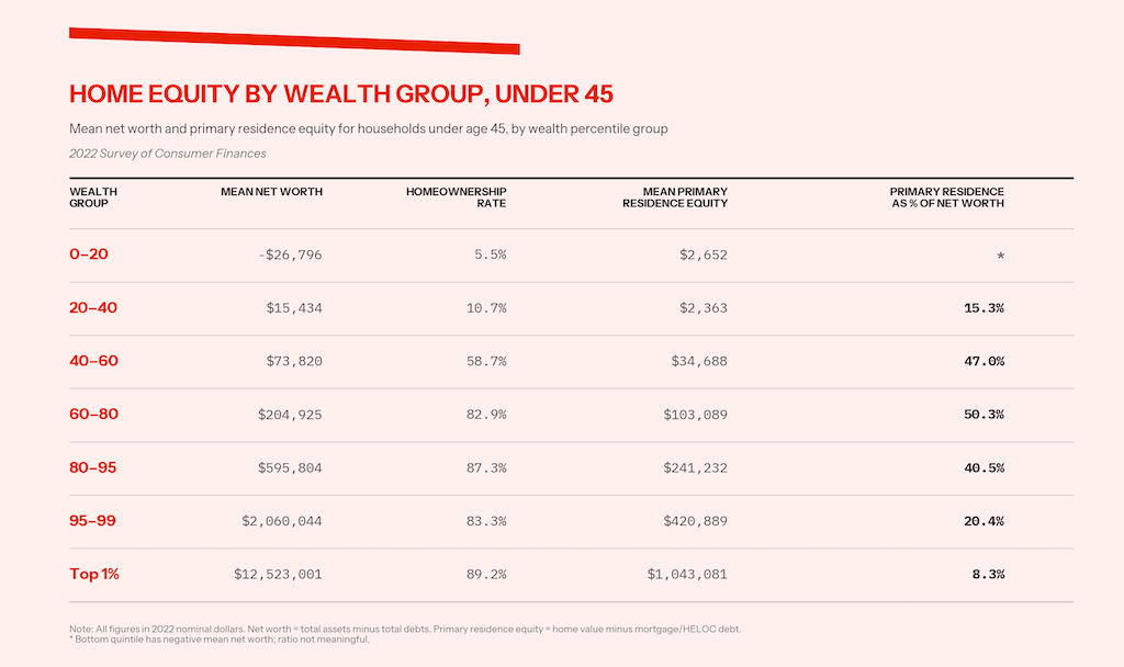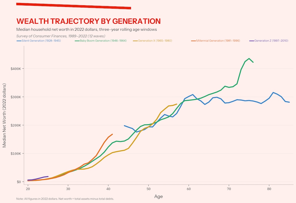 But wealth inequality within age groups swamps wealth inequality between them. The median household aged sixty-five to seventy-four has three times the wealth of the median household aged thirty-five to forty-four. But the 99th percentile of households aged thirty-five to forty-four has fifty times the wealth of that group’s median, and the top 1 percent of households aged thirty-five to forty-four average 134 times the median.
