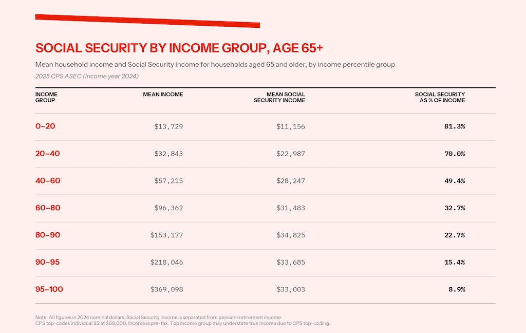 Americans sixty-five and older have the lowest income — approximately $35,000, including Social Security — of any age group besides those between fifteen and twenty-five. This isn’t surprising, given that both age groups largely consist of people who are too young or too old to work. Transferring money from working-age adults to kids and the elderly is one of the main functions of all welfare states.