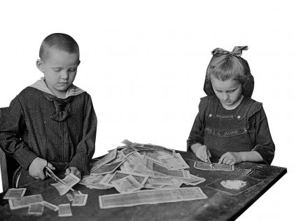 Children of the Weimar Republic play with devalued banknotes, 1919. Others found use for the worthless marks as wallpaper, craft and kite material, and kindling.